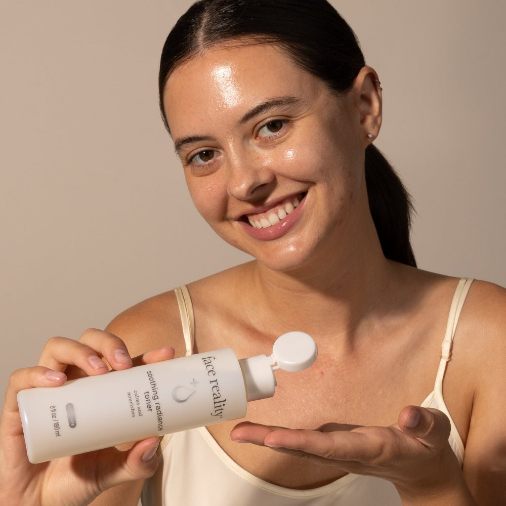 Face Reality’s Soothing Radiance Toner is a refreshing, alcohol-free formula designed to calm visible redness, deeply hydrate, and support your skin’s natural defenses. Powered by a blend of soothing botanicals including licorice root complex, centella asiatica, cucumber, and green tea extract—this toner instantly comforts the skin while providing antioxidant protection against environmental stressors.