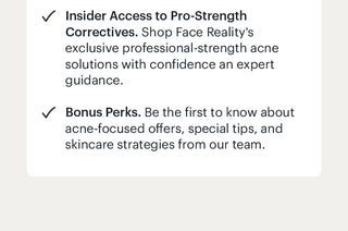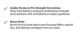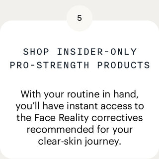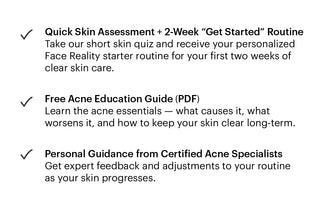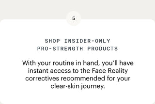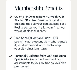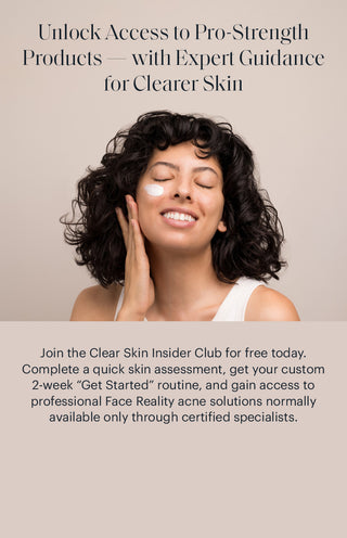 Join the Clear Skin Insider Club for free today. Complete a quick skin assessment, get your custom 2-week “Get Started” routine, and gain access to professional Face Reality acne solutions normally available only through certified specialists.