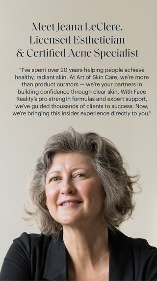 “I’ve spent over 20 years helping people achieve healthy, radiant skin. At Art of Skin Care, we’re more than product curators — we’re your partners in building confidence through clear skin. With Face Reality’s pro-strength formulas and expert support, we’ve guided thousands of clients to success. Now, we’re bringing this insider experience directly to you.”