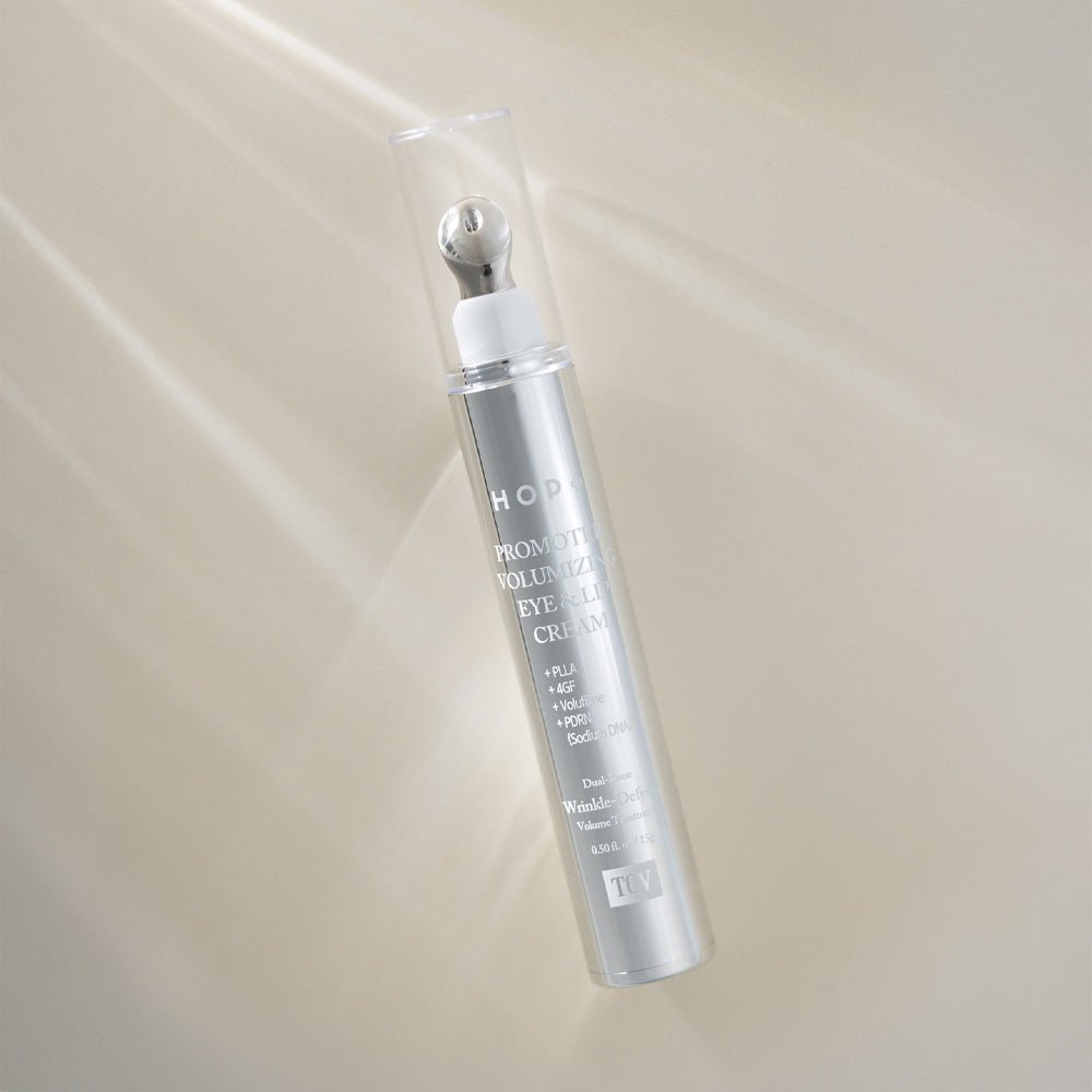 HOP+ PLLA Promoter Volumizing Eye & Lip Cream is a hydrating cream designed to rejuvenate tired, puffy eyes, and plump fine lines, wrinkles, and hollows with volufiline and PDRN.