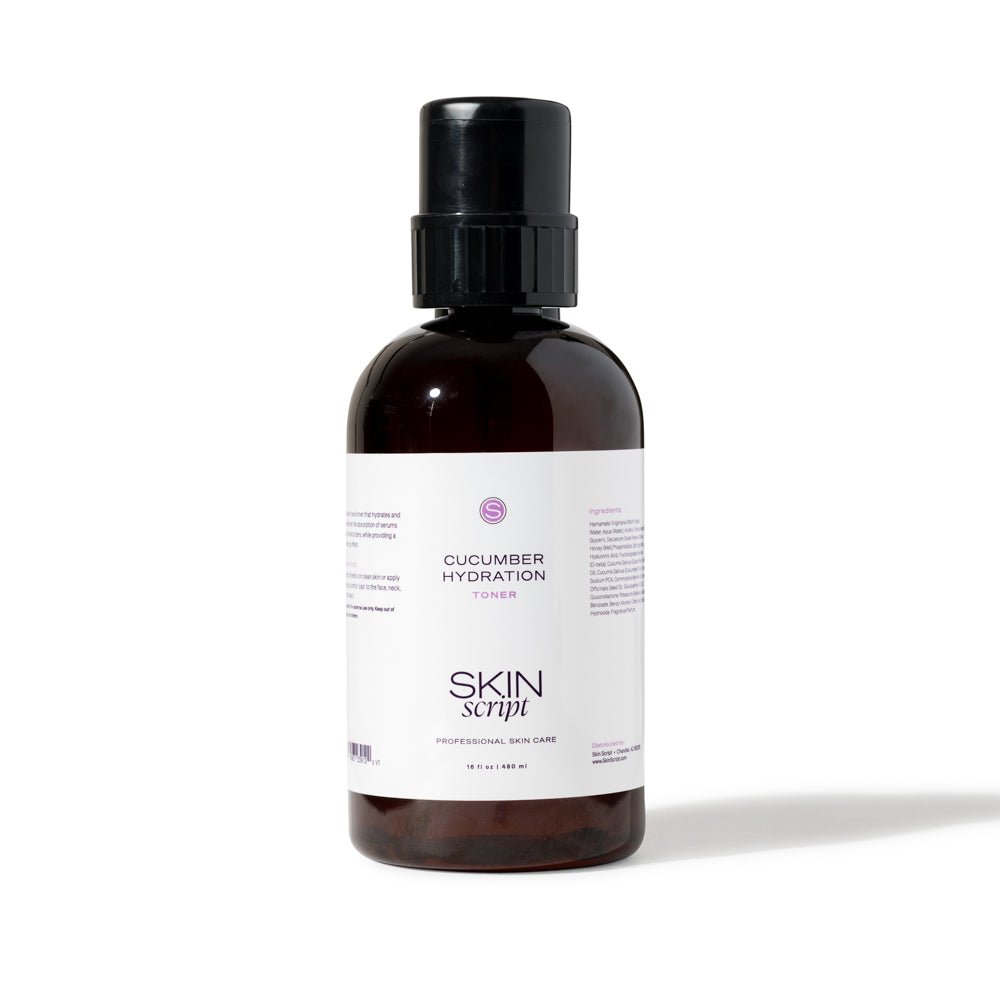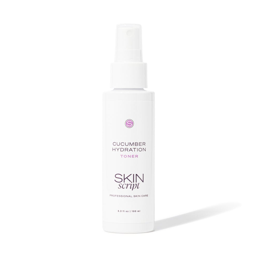 Skin Script Cucumber Hydration Toner cools, soothes, hydrates, and enhances serum and moisturizer absorption while reducing irritation.